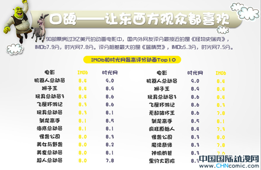 对于动画片,国内外观众各有评价标准。但大体上,大家对好电影的认识保持一致。比如,在IMDb和时光网的评分榜上,《机器人总动员》、《狮子王》、《玩具总动员3》、《飞屋环游记》四部电影均位列前四。但也有个别在国外反响平平,在国内很热的电影,比如《蓝精灵》。