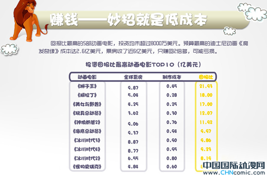 如今的好莱坞,制作成本超过一亿美元,就可称为大制作。在本文统计的60部票房过3亿美元动画电影中,有34部制作成本超过一亿美元。但是,投资高并不意味能赚钱;倒是投资相对较低,但品质过硬的作品,更容易有高回报。这一点,无论是动画电影,还是真人电影都是一样。目前被认为投资回报比最高的动画电影是《狮子王》,回报比21.93。而真人电影被认为是《灵动:鬼影实录》,该片制作成本15000美元,全球票房1.93亿美元,回报比超过12890。