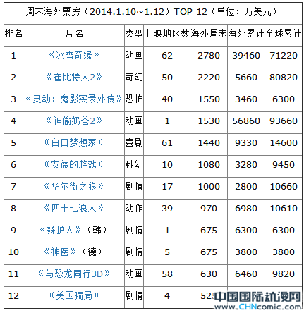 《冰雪皇后》反超《霍比特人2》登顶 追赶《卑鄙的我2》