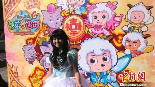 《喜羊羊与灰太狼大电影6之飞马奇遇记》16日即将在全国上映,电影出品方15日在广州举行首映礼,图为一身蓝马公主装扮的香港歌手糖妹现场助兴。
