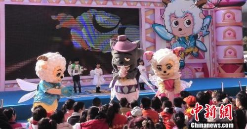 《喜羊羊与灰太狼大电影6之飞马奇遇记》16日即将在全国上映,电影出品方15日在广州举行首映礼,图为喜羊羊里面的“灰太狼”、“喜羊羊”等角色走出大银屏,和众多小朋友们一起载歌载舞。