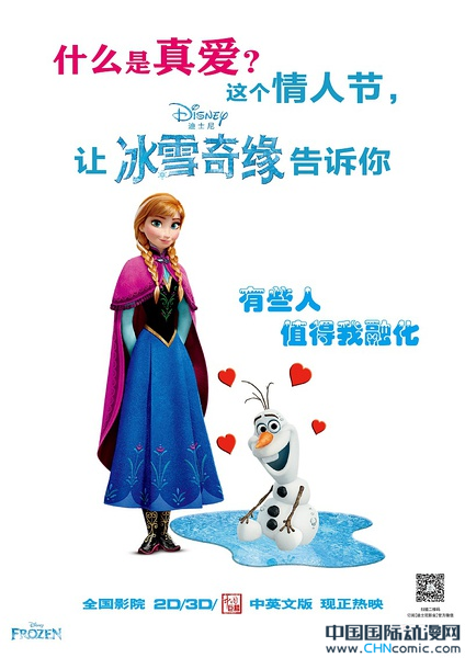 迪士尼最新经典、今年奥斯卡最佳动画入围者《冰雪皇后》 正在全国热映,影片上映后好评如潮,更因颠覆“真爱”的传统定义而引发影迷热议。随着情人节临近,今日《冰雪皇后》片方特地发布两款定制版情人节海报,邀全国观众一起探寻“真爱”的真谛。 《冰雪皇后》在线播放地址:http://movie.chncomic.com/show-232.html 《冰雪皇后》是迪士尼最新动画片,也是全球观众公认的迪士尼新经典。影片2月5日登陆中国内地影市,在数部国产大片的激烈竞争中凭借绝佳好口碑突围而出,做到逆市上扬,全国排片与票房都节节走高,更被不少业内人士看好是今年的第一部逆袭“神片”,有望重现去年《疯狂原始人》的票房奇观。 影片《冰雪皇后》上映后,片中关于“真爱”的全新定义就引爆网络,吸引大量观众热议。片中这个不同以往、颠覆传统的真爱,令不少观众备感惊喜,同时也大受感动。现在随着情人节临近,“真爱”主题的电影愈发吃香,影片也抓住时机推出两款定制版情人节海报,向观众抛出疑问——到底什么才是“真爱”?其中一款海报上小雪人雪宝给出了“有些人值得我融化”的答案来抛砖引玉;而真爱到底是如此,还是“一见钟情”?或者是“把别人的需要看得比自己更重要”?而真爱的载体是爱情、亲情、还是友情?这些就都需要观众自己去影院领会了。 随着《冰雪皇后》在全国绝赞热映,《冰雪皇后》在各大电影网站的评分也上演“神走势”,原本就已很高的分数不降反增——全部遥遥领先同档期在映的其他影片!这部全球获奖无数、奥斯卡大热的经典之作,同样获得中国观众好评如潮。随着口碑发酵,《冰雪皇后》也在逐渐展露票房潜力;而在某些网站的观众评分更高过《疯狂原始人》,因此更被业内看好将走出华丽的票房曲线。 《冰雪皇后》剧情讲述一个咒语令王国被冰天雪地覆盖,乐观无畏的安娜和热爱冒险的山民克斯托夫组队出发,踏上一段魔法层出不穷、旅程峰回路转的旅程,以寻找安娜的姐姐——冰雪皇后艾莎,破解她的冰封魔咒。一路上他们遇到搞笑的神奇雪人、各式奇幻精灵、意想不到的魔法迷阵,更在雪崩冰裂中步步惊心……他们最终能否拯救王国? 《冰雪皇后》全球叫好叫座,总票房累计已达9.1亿美元,其中北美票房更超越《狮子王》成为迪士尼最卖座的动画电影,原声大碟也四周荣膺公告牌排行榜冠军。作为月内惟一一部奥斯卡提名影片,《冰雪皇后》中/英文版2D、3D、中国巨幕正在全国热映中。