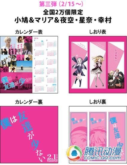 被读者们亲切地称为《友少》的人气轻小说——《我的朋友很少》的真人电影版将于2月1日在日本正式上映,届时入场观看将会获得官方派发的小礼品一份。礼品是印有动画版角色的书签和印有真人版角色的日历,一共有三个种类。