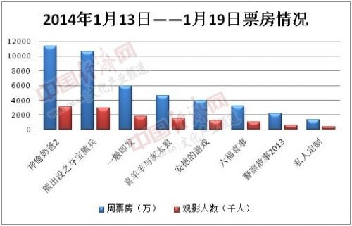内地电影市场2014年第3周(1.13-1.19)周总票房约4.5亿元,观影人次1333万。《神偷奶爸2》以1.1亿蝉联冠军,累计约2.1亿;《熊出没》3天以9891万位列第二;《一触即发》3天收进5827万位列第三;《飞马奇遇记》4天进账4547万位列第四;本周三部动画影片攻占票房近六成。