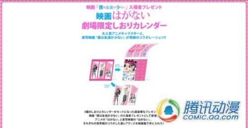 被读者们亲切地称为《友少》的人气轻小说——《我的朋友很少》的真人电影版将于2月1日在日本正式上映,届时入场观看将会获得官方派发的小礼品一份。礼品是印有动画版角色的书签和印有真人版角色的日历,一共有三个种类。礼品计划将分为三轮进行,第一轮从2月1日起到2月7日结束,限定五万份;第二轮从2月8日起到2月14日结束,限定两万份;第三轮则是从2月15日开始,限定两万份,所有礼品都是派完即止。第一轮礼品是印有动画版三日月夜空与羽濑川小鹰的书签,以及印有夜空饰演者北乃纪伊与小鹰饰演者濑户康史的日历;第二轮则是印有动画版柏崎星奈、楠幸村与志熊理科的书签,以及印有真人版角色的日历;最后一轮则是人气中二妹妹的羽濑川小鸠与高山玛丽亚的书签以及真人版角色的日历。《我的朋友很少》是由平坂读创作,马口铁绘制插画的日本轻小说,是一部讲述没有朋友的美少女们聚在一起,围绕交朋友、做现充(过充实的生活)而不懈挑战然而又屡试屡败的“残念系”青春恋爱喜剧。系列总体销量已累计发行622万部以上,曾于2011年和2013年两度被改编为电视动画。这次的真人版电影,将由因《监禁侦探》而成名的及川拓郎监督执导和编写剧本,开展一段与原作不同的原创故事。讲述理科发明了一台能让人在虚拟世界里体验GalGame的游戏机,身为游戏宅的星奈马上就沉迷进去了,结果成了一名在虚拟世界做现充的家里蹲。为了拯救这样的星奈,小鹰等人努力奋斗,其结果将会是……?主要演员羽濑川小鹰:濑户康史三日月夜空:北乃纪伊柏崎星奈:大谷澪楠幸村:高月彩良志熊理科:神定真央羽濑川小鸠:久保田纱友高山玛丽亚:山田萌萌香西园寺:栗原类田中:渡边大柏崎天马:石原良纯