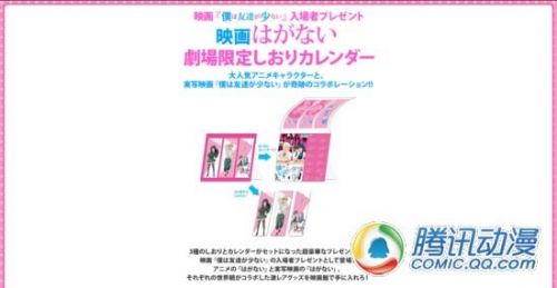 被读者们亲切地称为《友少》的人气轻小说——《我的朋友很少》的真人电影版将于2月1日在日本正式上映,届时入场观看将会获得官方派发的小礼品一份。礼品是印有动画版角色的书签和印有真人版角色的日历,一共有三个种类。礼品计划将分为三轮进行,第一轮从2月1日起到2月7日结束,限定五万份;第二轮从2月8日起到2月14日结束,限定两万份;第三轮则是从2月15日开始,限定两万份,所有礼品都是派完即止。第一轮礼品是印有动画版三日月夜空与羽濑川小鹰的书签,以及印有夜空饰演者北乃纪伊与小鹰饰演者濑户康史的日历;第二轮则是印有动画版柏崎星奈、楠幸村与志熊理科的书签,以及印有真人版角色的日历;最后一轮则是人气中二妹妹的羽濑川小鸠与高山玛丽亚的书签以及真人版角色的日历。《我的朋友很少》是由平坂读创作,马口铁绘制插画的日本轻小说,是一部讲述没有朋友的美少女们聚在一起,围绕交朋友、做现充(过充实的生活)而不懈挑战然而又屡试屡败的“残念系”青春恋爱喜剧。系列总体销量已累计发行622万部以上,曾于2011年和2013年两度被改编为电视动画。这次的真人版电影,将由因《监禁侦探》而成名的及川拓郎监督执导和编写剧本,开展一段与原作不同的原创故事。讲述理科发明了一台能让人在虚拟世界里体验GalGame的游戏机,身为游戏宅的星奈马上就沉迷进去了,结果成了一名在虚拟世界做现充的家里蹲。为了拯救这样的星奈,小鹰等人努力奋斗,其结果将会是……?【主要演员】羽濑川小鹰:濑户康史三日月夜空:北乃纪伊柏崎星奈:大谷澪楠幸村:高月彩良志熊理科:神定真央羽濑川小鸠:久保田纱友高山玛丽亚:山田萌萌香西园寺:栗原类田中:渡边大柏崎天马:石原良纯