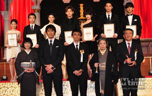 获奖者大合影 前排左起:余贵美子 阿部宽 树木希林 山本哲也(代大泷秀治领奖) 众新人奖得主合影 左起:染谷将太 二阶堂富美 沈昌珉 东出昌大 桥本爱 松坂桃李 武井咲 3月8日,第36届日本电影学院奖(又称:日本奥斯卡)颁奖典礼在东京新高轮王子饭店举行。由吉田大八导演,去年颁奖季大热影片《听说桐岛要退部》不负众望,一举夺得最佳影片、最佳导演、最佳剪辑三项重量大奖,并成为了日本全国影片票选出的话题奖中的最具话题影片。而阪本顺治导演的《北方的金丝雀》,同样也拿到了最佳摄影、最佳灯光、以及最佳电影配乐三项技术奖项。 《听说桐岛要退部》以高中排球社团的明星队员桐岛突然退社为契机,真实地反映了校园中复杂的等级结构和人际关系,在去年的颁奖季上,这部被誉为“或许是21世纪最好的青春电影之一”的电影包揽了横滨电影节最佳电影、每日电影奖优秀奖以及电影旬报评出的年度十佳的第二名,如今又以最佳影片和最佳导演两项最有分量的大奖,再一次得到了日本奥斯卡的认可。面对学院奖的大奖,导演吉田大八显得有些紧张,但仍不忘称赞以缺席颁奖礼的神木隆之介为首的一众年轻演员,认为他们以自己的才华和对电影的野心,出色诠释出了年轻人对青春的微妙心理,并感叹“日本电影的未来十分光明”。《听说桐岛要退部》中的桥本爱和东出昌大也同时得到了最佳新人奖。 最佳男女主角得主:阿部宽 树木希林 个人奖方面,除了刚才提到的最佳导演奖颁给了吉田大八,最佳编剧得主内田贤治同样是得奖专业户,这已经是他继在上海电影节、横滨电影节、旬报上摘取最佳编剧后,再一次凭借《盗钥匙的方法》夺得此奖。 虽然在最佳男主角提名中连续遭遇役所广司、堺雅人、野村万斋、森山未来四位强劲对手,阿部宽依然异军突起,凭借在《罗马浴场》中饰演的穿越到现代的古罗马浴场设计师,继蓝丝带奖后,再次斩获最佳男主角。首次获封学院奖最佳男主角的阿部宽登台时露出了惊讶,“我还在想不会吧。现在全身的鸡皮疙瘩都立起来了”,同时表达了如果再站到颁奖典礼上,一定要是以日本人的角色。 70岁的戏骨树木希林,则凭借着《记我的母亲》中患老年痴呆症的母亲一角,继2008年《东京塔》后再次获得了最佳女主角,这也让她成为最年长的2度获得最佳女演员殊荣的演员。 最佳男配角则颁给了在《只为了你》中有出色表现,去年10月因肺扁平上皮癌不幸去世的老戏骨大泷秀治,87岁的高龄也让大泷秀治成为了最佳男配角中最高龄的获奖者。而最佳女配角,则落到了同样在《只为了你》中有出色表演,已是第三次获奖(另外两次分别为:《入殓师》(2008)和《亲爱的医生》(2009))的余贵美子。 2012年大热动画片《狼之子雨与雪》摘得了最佳动画电影奖,再一次证明了细田守的动画新生力量领军人物的地位。最佳外语片奖则颁给了去年在日本创造了票房奇迹的《无法触碰》。
