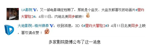 据可靠消息证实,蓝天工作室与二十世纪福斯联手带来的续集3D动画《里约大冒险2》将于4月11日在内地上映,与北美同步。中国观众将在第一时间领略到鸟儿们的新一轮狂欢。国内多家影院官微也纷纷确认了《里约大冒险2》将同步上映的这一消息。