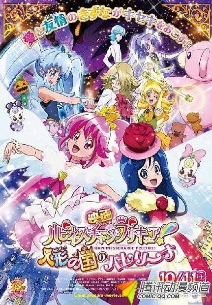 《Happiness Charge 光之美少女!》是一部为纪念《光之美少女》系列迎来十周年庆而开播的大人气电视动画,正在ABC·朝日电视台播出。该作品的剧场版于昨日6月30日正式宣布,电影定名为《Happiness Charge 光之美少女!之‘人偶之国的芭蕾舞者’》(电影原名:映画ハピネスチャージプリキュア!人形の国のバレリーナ),将于2014年10月11日在日本全国上映。剧场版的故事舞台定位于人偶们居住的人偶王国,从剧场版的宣传海报可以看到,可爱天使爱乃惠和公主天使白雪姬与一众人偶载歌载舞的曼妙身姿,而在可爱天使爱乃惠的旁边还站着一个谜之女孩。这名女孩究竟会成为她们的新朋友,还是新的天使?故事舞台的人偶王国又会是怎样一个国度?天使们在剧场版里又会有怎样的变身场面?就让我们一同期待充满欢乐能量的光之美少女剧场版!2014年剧场版的宣传标语为:爱与友情的牵绊将唤起奇迹!这张宣传海报从7月19日开始将会登陆日本全国的电影院,不仅如此,从当天开始更会发售电影预售券,并随券附送带饰物的主题袋子作为特典。电影上映情报:2014年10月11日(星期六)日本全国上映!动画主要制作人员:导演:今 千秋剧本:成田良美角色设计:佐藤雅将 大田和宽作画监督:大田和宽美术监督:柴田聪色彩设计:泽田丰二制作担当:大田有纪动画主要配音人员:可爱天使爱乃惠:中岛爱公主天使白雪姬:潘惠美蜜天使大森悠子:北川里奈命运天使冰川伊绪奈:户松遥缎带:松井菜樱子墨镜:小堀幸
