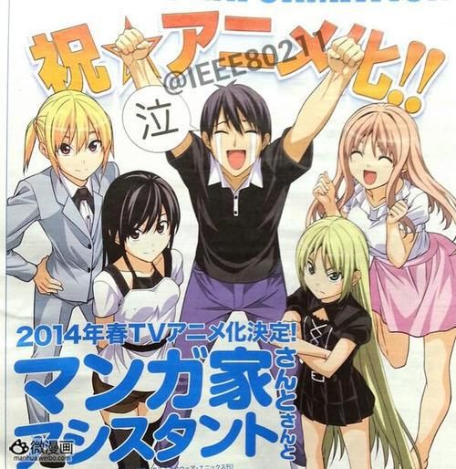 此前宣布动画化的人气搞笑漫画《漫画家与助手》公开动画化详情,预定2014年春季以TV动画形式播出。动画将由古田丈司(《Keroro军曹》演出、《信长之枪》副监督)担任监督,伊丹あき(《虫师》《恶之华》)担任系列构成,鶴田仁美(《足球骑士》人设、《银魂》作画监督)担任角色设计,制作过《Q弟侦探因幡》《恶之华》的ZEXCS负责制作。《漫画家与助手》描写围绕漫画家 爱徒勇气 和助手 足須沙穂都 两人日常生活的爆笑漫画家喜剧故事,2008年~2012年期间在史克威尔艾尼克斯旗下各杂志和网站连载,从人气上一度被认为是将动画化的作品,续篇漫画《漫画家与助手2》今年开始在《YOUNG GANGAN》连载。【STAFF】原作:ヒロユキ监督:古田丈司系列构成:伊丹あき动画人设:鶴田仁美动画制作:ZEXCS【CAST】(DRAMACD版)愛徒 勇気(あいと ゆうき)声 - 福山潤足須 沙穂都(あしす さほと)声 - 能登麻美子音砂 みはり(おとすな みはり)声 - 戸松遥風羽 りんな(ふわ りんな)声 - 豊崎愛生黒井 せな(くろい せな)声 - 釘宮理恵