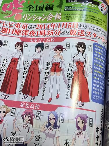 据《Young GANGAN》消息,作为TV系列第三期而推出的TV动画《咲-Saki-全国篇》确认将于2014年1月5日(日)深夜1时35分在东京电视台开播。同时继OP确认由桥本美雪演唱之后,ED也确认由全国篇新角色永水女子、姬松高校、宫守女子三校演唱。另外,《咲-Saki-全国篇》从11月18日开始每日更新永水女子、姬松高校、宫守女子三校的声优阵容,目前已经公开了早见沙织、水桥香织、赤﨑千夏、寿美菜子等人气声优的出演。从最近2日公开的声优情况来看,之前日本某博客曝光的小道消息声优名单很可能是准确的,根据该小道消息《咲-Saki-全国篇》还将有佐藤利奈 、内田真礼、田村由香里等大牌声优的出演。《咲-Saki-全国篇》是小林立百合麻将漫画《咲-Saki-》继2009年的《咲-Saki-》、2012年的《咲-Saki-阿知贺篇》之后,系列第3部TV动画作品,讲述本篇漫画全国大会篇的剧情。12月25日,《咲-Saki-》本篇漫画第12卷、前传《Shinohayu》第1卷、四格漫画《咲日和》第3卷将同日发售。【放送情报】TX(东京电视台) …1/5(日) 1:35~ TVO(大阪电视台)…1/7(火) 2:10~ TVA(爱知电视台)…1/5(日) 1:35~ TSC(濑户内电视台)…1/8(水) 2:10~ TVh(北海道电视台)…1/10(金) 2:30~ TVQ(九州放送)…1/5(水) 2:30~ 【CAST】神代小莳:早见沙织石户霞:大原沙耶香薄墨初美:辻亚由美滝见春:水桥香织狩宿巴:赤﨑千夏愛宕洋榎:松田颯水末原恭子:寿美菜子愛宕絹恵:中津真莉子上重漫:伊达朱里纱真濑由子:佳村遥爱丝琳·威夏尔特:水野麻梨子鹿仓胡桃:丰田萌绘以下为未确定部分臼泽塞:佐藤利奈 姉帯丰音:内田真礼 戒能良子:田村睦心 佐佐野莓:松来未祐 瑞原早璃:田村由香里赤阪郁乃:野田順子梅甘·戴文:小见川千明