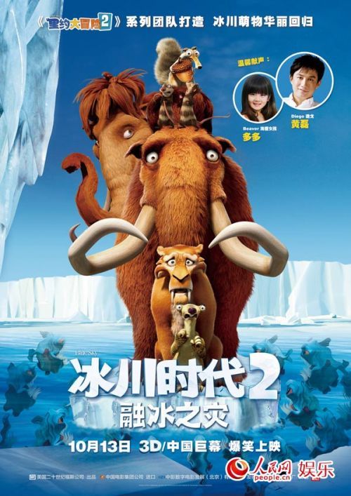《冰川时代2:融冰之灾》-鼠奎特海报国际在线专稿:国庆即将到来,进入10月黄金档期,也迎来了新一波观影热潮。美国二十世纪福斯电影公司继《X战警:逆转未来》、《里约大冒险2》、《猩球崛起:黎明之战》等多部影片大获成功之后,即将又有两部大片在10月奉献给中国观众。一部是由全球畅销小说改编的科幻冒险巨制《移动迷宫》,10月28日上映,另一部则是即将于10月13日上映,深受全球观众喜爱的经典卖座动画系列《冰川时代2:融冰之灾》3D版。随着距离上映不足20天,片方二十世纪福斯今日再度发布了新的《冰川时代2:融冰之灾》》的宣传物料——小松鼠鼠奎特可爱海报和中文预告,那只无敌贱、苦逼励志小松鼠鼠奎特带上了3D眼镜,呆萌可爱,预告片中目前当红的星爸黄磊现身,邀请大家一同在国庆假期之后进到影院享受这场爆笑的冰川冒险之旅。《冰川时代》系列是获得过奥斯卡提名的蓝天工作室的代表作,已经上映4集电影,全球累计票房已经超过20亿美金,而片中猛犸象曼尼、树懒希德、剑齿虎迪亚哥以及小松鼠鼠奎特等性格鲜明的角色,赢得了全球不分年龄段观众的喜爱。《冰川时代2:融冰之灾》是这一系列中备受好评的一集,由《里约大冒险》系列导演卡洛斯沙尔丹哈指导,曾于2006年上映。时隔8年,这部电影从胶片转为数字3D版本经过重新调色和配音后重登大银幕,将带给观众全新的娱乐体验。《洛杉矶时报》曾毫不吝啬的夸赞这部影片尤其适合家长带孩子观看,这次重映也让新一代的孩子有机会在影院观看这部电影史上最经典的动画片,而之前看过的观众,也可以去影院重温当年的欢乐和震撼。《冰川时代2:融冰之灾》,主要讲述正当冰川动物王国欢天喜地庆祝新纪元到来之时,一场灾难正悄悄地向这些萌物们袭来:巨大的天然冰山正在融化,冰河期即将结束,融化的雪水即将淹没它们安逸的家园。这时,“冰川三兄弟”猛犸象曼尼、树懒希德和剑齿虎迪亚哥已经觉察到即将到来的灾难,它们和山谷里的其他动物一起南征,沿途历经种种艰险,最终到达安全的彼岸。在旅途中,一直认为自己是最后一头猛犸象的曼尼遇到了母猛犸象爱丽,并和它谈起了恋爱。不过爱丽一直以为自己是只小负鼠,这让曼尼头痛不已……《冰川时代2:融冰之灾》有每个观众钟爱的元素,萌物、爆笑冒险以及浩大的场面。蓝天工作室的金字招牌为这部影片制作护航,在呈现史前冰河时期的壮丽奇景的同时,更在细节上下足了功夫,使人物造型,如毛色、质感更加流畅细致。3D升级之后的版本,将给观众带来更逼真的洪水灭顶以及猛兽来袭的灾难震撼效果。加上有深受观众喜爱的黄磊和多多父女的配音首秀,这部电影将是10月片单中不可错过的一部电影。