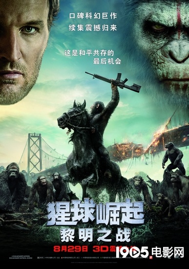 《猩球崛起:黎明之战》中文海报今年夏天最受期待的电影《猩球崛起》的续集《猩球崛起:黎明之战》终于传来了定档期的好消息,今日片方二十世纪福斯电影发布了正式版的中文海报和中文预告,证实这部目前在全球获得盛赞的科幻巨制确定由中国电影集团公司引进内地,中国电影股份有限公司及华夏电影发行有限责任公司联合发行,将于8月29日在内地影院上映。“神作”定档829 正式版中文海报&预告曝光 2011年根据科幻经典《人猿星球》打造的前传《猩球崛起》在全球取得了5亿美金票房,同年引进中国内地赢得了不俗的票房和口碑,获得了影评人和观众的一致称赞。2014年,这部影片的续集《猩球崛起:黎明之战》重磅归来吸金实力不容小觑,截止到7月18日全球累计票房已达2.3亿美金。票房一路飘红,离不开这部影片的好口碑护航。 《科洛弗档案》导演接班安迪·瑟金斯继续演猩猩领袖凯撒《猩球崛起:黎明之战》故事紧接第一集,10年后,第一集片尾的致命“猿流感”病毒肆掠,人类经历了灭顶之灾,只有一小部分幸存下来,聚居在旧金山。智能进化的猿族首领凯撒也在深山密林中与族人建立了自己的家园,并试图将人性带入猿族社会。然而随着一小队人类的到访,他们的宁静被打破。为了捍卫各自最后的家园,最终究竟是谁能够握有地球统治权?一场激烈的人猿大战终于无可避免的爆发…… 本集导演由上集的鲁伯特·瓦耶特换成了《科洛弗档案》、《美版生人勿进》的导演马特·里夫斯,因饰演《指环王》系列声名大噪的世界首席动作捕捉演员安迪·瑟金斯再度担纲主演,饰演传奇人猿领袖猩猩凯撒,《蝙蝠侠:黑暗骑士崛起》加里·奥德曼、《惊天危机》杰森·克拉克、《后人》朱迪·格雷尔、《碟中谍3》凯丽·拉塞尔、《波斯王子:时之刃》托比·凯贝尔等倾力加盟。马特·里夫斯说:“我小时候很迷恋《人猿星球》,也很喜欢后来的《猩球崛起》。《猩球崛起》最令我感动的地方当然是凯撒这个角色,以及它的饰演者安迪·瑟金斯。他演活了这个角色,凯撒在不断的进化和成长,这更让我产生共鸣想到了我的儿子。”特效神乎其技亮瞎眼主题立意震撼人心第一集《猩球崛起》中惊人的动作捕捉特效,以及影片中所透露的进化、人类自食恶果、自由、种族以及新文明等话题也引起了观众的深入探讨,时而霸气外露时而萌的人猿领袖——凯撒,俘获了全世界观众的心。续集《猩球崛起:黎明之战》无论是从故事、立意、特效技术等都比第一集的格局更为庞大。《幕后制作》以及《走进好莱坞》称该片神乎其技的特效有望角逐今年奥斯卡最佳特效奖。马特·里夫斯透露:“我希望这部电影更胜过前一部电影,不管是基调还是视觉呈现。《阿凡达》金奖数字科技团队维塔数码(WETA DIGITAL)依然为特效保驾护航,《猩球崛起》运用很多动作捕捉技术,大部分都限于布景内,我们这部电影除了以3D拍摄,百分之九十五的内容都是在户外场景拍摄的,更让人相信那是真实世界。猩猩的文明十分庞大,但我们就这么几个动作捕捉摄影的演员,得运用这六到八个人呈现成千上万的猩猩大军,是一件不可思议的事情。”该片的故事、主题震撼人心同样好评爆棚,《纽约日报》盛赞该片“是猩球系列电影中最有趣,最激动人心,最刺激且最有感染力的影片。”导演马特·里夫斯透露:“影片在情绪层面的调动才是最让人期待的。影片整体是围绕着两个家庭来讲述的,一个是人类家庭,一个是猿族家庭,而我们聚焦的问题是,以这两个家庭为代表的两个种族之间是否具有和平共处的可能性。和平共处还是必须你死我亡?这是一个值得思索的问题。电影里没有所谓的坏人,因为这两个种族在影片中都充分有效地展示了以自己生活经历为基础的观点和立场。”