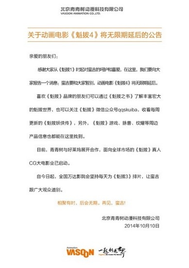 官方称《魁拔4》将无限期延后1905电影网讯 据动画电影《魁拔》的官方微博发布的公告称,该系列第四部动画制作将无限期延后,并对从《魁拔1》开始就一直以来支持和喜爱该电影的观众表示感谢。看来,如今或许真要和片中可爱的主人公蛮吉说声再见了。《魁拔》系列是国产动画电影中的一颗新星,作为国内首部开创的热血玄幻动画电影,《魁拔》创造了由人、神和魁拔三个物种组成的新的玄幻世界观,其画风脱胎于日系动漫但又有着中国动画本土特色,上映之后让人眼前一亮。但这部“纯国货”的动画电影从首部上映伊始便十分“坎坷”。一直以来,《魁拔》系列口碑好于预期,但票房却相当惨淡。据悉,《魁拔1》制作费用为3500万,上映之时10天仅入账265万元,不到制作和发行成本的8%,据不完全统计,前两部的最终票房分别为350万和2600万元。蛮吉,再见!正在上映的《魁拔Ⅲ战神崛起》在刚刚落下帷幕的国庆档中表现中规中矩,截止到7号的票房为2230万元。而此次《魁拔4》无限期延后的原因或许是投入与产出的完全不成比例,制作方在资金上倍感压力。尽管获得了口碑,但票房回报却不足以撑起整个团队再进行下一部的制作。在整个日漫作为受众主流的大环境以及大部分国产动画定位群体偏低下的原因,《魁拔》的票房表现惨淡或许有根可循,从现有的结果上来看虽然遗憾,但如果其他团队能够秉承《魁拔》专业做动画的认真态度,国产动画的未来依然充满希望。官方微博文字如下:亲爱的朋友们,感谢大家从《魁拔1》时起对蛮吉的呵护和喜爱,在这里,我们要向大家报告一个消息:蛮吉要和大家告别,动画电影《魁拔4》将无限期延后。喜欢《魁拔》品牌的朋友们可以通过《魁拔之书》了解丰富宏大的魁拔世界,也可以关注《魁拔》微信公众号收看每周更新的《魁拔妖侠传》,另外,《魁拔》游戏、脉兽、纹耀等周边产品信息也都能在这里找到。目前,青青树与好莱坞展开合作,面向全球市场的《魁拔》真人CG大电影业已启动。自今日起,全国万达影院会坚持每天为《魁拔3》排片,让蛮吉跟广大观众道别。相聚有时,后会无期。再见,蛮吉!