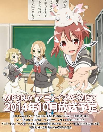 根据「电击G's magazine」2014年9月号消息,タカヒロ(斩?赤红之瞳!原作者)Project第4弹——原创TV动画《结城友奈是勇者》(結城友奈は勇者である)将于2014年10月起在MBS“ANIME-ISM”档播出。动画的剧情、制作情报已经得到解禁,本作的故事发生在神世纪300年,主要讲述结城友奈是初中2年级学生,她天天在学校里过着与很多朋友一同听课、进行社团活动、玩耍的平稳生活。不管怎么看这都是非常普通的女孩的生活日程,但是只有一点与其他孩子决定性不同的地方,那就是她所属的名为“勇者部”的社团活动。以部长犬吠埼风为中心的该社团的活动内容与被谜团包围的叫做Vertex的不可思议的存在有关系,本作正是以描写友奈等人的“勇者部”的活动为主。