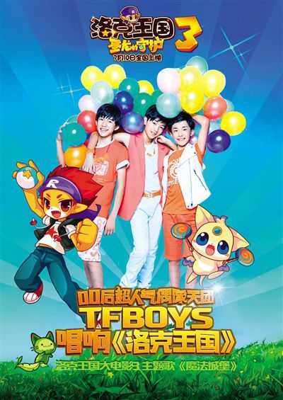 即将于7月10日全国公映的动画电影《洛克王国3圣龙的守护》(简称《洛克王国3》)日前发布主题曲,该主题曲为TFBOYS组合的成名曲《魔法城堡》。这也让《洛克王国3》成为“00后粉丝电影”。TFBOYS是谁?你不知道就OUT了!00后少年组合TFBOYS今年开始以不可思议的速度在网络爆红:百度输入关键词“TFBOYS”,搜索结果已经超过1亿,这个数字甚至秒杀了今年最走红的韩流明星;微博上,TFBOYS同样当红不让,组合三位成员中,王俊凯和王源的微博粉丝数都超过300万,转发量更是惊人。而《洛克王国》的粉丝则以儿童为主,作为一个在线绿色社区,自2010年上线至今,《洛克王国》累计注册用户近两亿,当第一部和第二部大电影推出后,票房累计也超过1亿。这次邀请TFBOYS来演唱主题曲,影片的相关负责人表示:“《洛克王国》和TFBOYS的粉丝不是简单意义上的数量叠加,《魔法城堡》这首歌和《洛克王国》电影恰巧都是以‘魔法’为主题,正好符合孩子们童年时的梦幻想象。”粉丝电影横行“洛克”瞄准00后今年暑期档有不少“粉丝电影”,除了快男粉丝电影《我就是我》之外,还有郭敬明的《小时代3》,韩寒的处女作《后会无期》。相比这些电影纷纷把目标瞄准到“80后”和“90后”,《洛克王国3》和TFBOYS联手后,则将目光瞄准了00后的粉丝群体。据悉,TFBOYS组合的三名成员里除王俊凯1999年出生,其他两位都是2000年出生,标准的00后少年组合,粉丝以初中以下的低龄女生群体为主,也包括一些大龄具备经济条件的阿姨粉——她们很多拥有00后孩子。(记者 刘嫣)