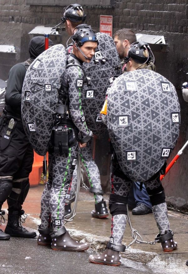 梅根·福克斯领衔主演的真人版《忍者神龟》日前正在美国热拍,当地时间5月9日,在片中扮演四位“神龟”的演员杰瑞米·霍华德、皮特·普劳泽克、阿伦·瑞奇森、诺尔·费舍终于亮相纽约片场——从片场照可以看出,影片将使用《猩球崛起》中的“实景动作捕捉”技术。在当日拍摄的戏份中,四人均身穿用于动作捕捉的服装,背部呈现出龟壳的形状,手脚还挂着镣铐,走下一辆大型集装箱车,疑似被捕。片场还出现了众多身穿作战服戴着面具装扮奇特的演员,手持电棍指着他们。 根据此前官方透露的信息,此次的真人重启版《忍者神龟》将是“一部基于漫画和卡通的重新绘制”。影片的制作团队阵容齐整,迈克尔·贝将与伙伴布拉德·福勒、安德鲁·福姆共同监制;剧本则由因《碟中谍4》而声名鹊起的两位编剧乔什·阿佩尔鲍姆和安德雷·纳梅克撰写;导演一职则花落乔纳森·理贝斯曼,曾执导《洛杉矶之战》的他特别强调,“《忍者神龟》不仅是部动作片,还将聚焦兄弟情、友谊以及责任”。四位神龟的扮演者则分别是:皮特·普劳泽克(饰演达芬奇)、诺尔·费舍(饰演 多拉太罗)、杰瑞米·霍华德(饰演 米开朗基罗)、阿伦·瑞奇森(饰演 拉斐尔) 。四位神鬼的扮演者:杰瑞米·霍华德、皮特·普劳泽克、阿伦·瑞奇森、诺尔·费舍《忍者神龟》自从1984年诞生以来一直备受世界各地观众喜爱,此前动画版、真人版的电影都拍过了。此番派拉蒙拍摄的真人版《忍者神龟》电影只是一个开始,他们还将制作新的《忍者神龟》电视动画系列片、游戏等一系列的媒体产品。据悉,这部真人版《忍者神龟》预定于2014年6月6日北美上映