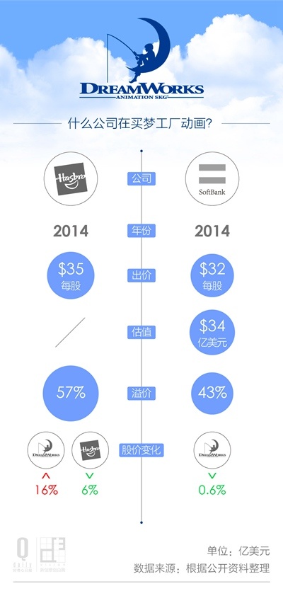 但卡森伯格并没有那么好说话。梦工厂动画给孩之宝的报价比日本软银要高,每股 35 美元,随后孩之宝股价下跌,投资者并不看好。卡森伯格期望对梦工厂动画的控制或许也是两次交易失败的原因之一,这也可能加大了梦工厂今后找个好东家的难度,把自己放在了被动的位置。“我看不出来孩之宝为什么会着急买梦工厂动画,”美国券商 BTIG 的分析师 Richard Greenfield 表示。