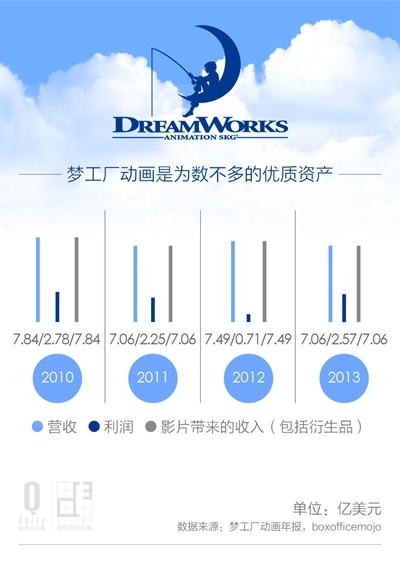 跟其它动画工作室不一样,梦工厂动画一直在单打独斗――它是一个内容制造商,收入来源大部分来自于电影票房本身,不像被迪士尼收购后的皮克斯有了稳定的发行和衍生品销售渠道,梦工厂动画一直在寻求外部合作。但是梦工厂动画有着优质的内容资源,也需要一个更大的公司确保以后的发展空间。