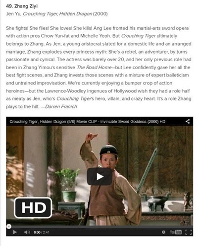 在介绍章子怡的角色时,《娱乐周刊》(Entertainment Weekly)写道:当时章子怡刚刚过20岁,她之前饰演的唯一一个角色是张艺谋的《我的父亲母亲》,但是李安给了她最好的打斗场面,而章子怡将这个角色诠释到极致。在章子怡所有功夫片角色中,“宫二”是另一座高峰,堪称“玉娇龙”进阶版,章子怡凭此角色获得华语电影界普遍肯定,却未能入此榜单,有网友评论:看来编辑还没看《一代宗师》,华语电影“走出去”任重道远。
