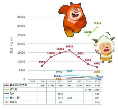 每年12月到次年3月初的贺岁档都是大片扎堆上映的时期,对于尚显弱势的国产动画电影而言,一方面贺岁档能提供较大的观众基础群,另一方面各大片又对动画电影产生了强烈竞争与挤压。细分下的贺岁档由于贺岁档横跨圣诞、元旦、春节、元宵、情人节多个节日,因此可据此对其进行细分。对于国产动画电影而言,这一时段中相对成熟的档期有元旦档、寒假档、春节档,用一句话总结各档特色的话,分别是青年动画新突破、一家欢喜几家愁、有待进一步培育。元旦档一共有4部动画电影上映,其中《十万个冷笑话》、《龙骑侠》、《闯堂兔2》为国产,而《斑马总动员》为南非作品。《龙骑侠》、《闯堂兔2》、《斑马》受众年龄层相对低幼,票房相比去年同期上映的3部动画电影有所增长,但由于档期时间较短,只比普通的周末多一天时间,而小观众在元旦过后即进入期末考试前的紧张状态之中,因此元旦过后票房衰减明显,总票房提升空间有限。本档期中比较特别的是《十万个冷笑话》,该片在内容风格、观众年龄段、营销方式上都有所突破,也因此成为继喜羊羊、熊出没之后第3部票房过亿元的国产动画电影。不同于2014年寒假前夕美国动画电影《神偷奶爸2》卷走3.2亿元票房,本年度进口动画电影避开了寒假档(详见表二)。观今年寒假档的动画电影表现,可谓是“一家欢喜几家愁”:处于上升期的“熊”在本档期再展雄风,《雪岭熊风》以2.9亿元的票房荣获第一名,比第一部增加4000多万元,这一增量相当于好几部中小体量的动画电影的票房总产出了。《喜羊羊》系列则延续前两年的下滑趋势,票房达该系列电影新低。同档上映的《摩尔庄园3》、《蜡笔总动员》分别获得839万元、652万元,表现并不理想。某片方表示,由于缺乏档期判断经验,只重点考虑了“熊”“羊”,却没有注意到《奔跑吧兄弟》(综艺电影,与《熊出没》同在1月30日上映,总票房4.3亿元)的主要目标观众也是小学生。选择在春节期间上映的国产动画电影只有两部,成绩均欠佳:《新年来啦之大闹除夕》于大年初一上映,该片映前宣传并不多,只收获65万元票房;《兔侠之青黎传说》上映于大年初三,票房621万元。这个档期对于动画电影而言也许还不够成熟:在举国欢度新春佳节的日子里,没有充分的理由全家出动去观看一部国产动画片。春节之后,于2月28日上映的好莱坞大片《超能陆战队》目前票房已过3亿元,片中的机器人大白赢得了观众们的普遍喜爱,有网友称“大白终于撼动了瓦力的影史最萌机器人的地位”。从蓝猫到“羊”“熊”:商业模式的极限?在贺岁档影市热闹的另一面,是动画电影续集作品的普遍衰退。有网友调侃,“十年生死两茫茫,喜羊羊、灰太狼。舒克贝塔,蓝猫话凄凉。”这多少反映了中国动画电影业的现状。对于蓝猫品牌的衰退,曾有这样的总结:蓝猫出名了,可是三辰集团却没过上好日子,只能为五斗米折腰。面对庞杂的产业链,非专业的人在做专业的事,这本身就是一种隐患。一个动漫企业不可能成为万金油企业,可现实逼得这家公司不得不变成万金油。本来制作动画片是三辰集团的专长,但生产出动画片后得经历这样一个过程——将动画片卖给电视台换来一堆广告时间,然后不得不去卖广告,变成广告公司;将产品授权给儿童用品生产商,却没有销售渠道,只好又成了众加盟店的“盟主”;此外,还要按照行业规则管理那些被授权的企业。詀在2015年,回溯喜羊羊品牌十年来的发展过程,我们再一次看到了这种依托内容驱动全产业链的商业模式的极限:喜羊羊的大电影可比作蓝猫在全国广开加盟店,接踵而来的电视动画、大电影口碑危机,以及盗版泛滥、授权难以管理等问题,与蓝猫当年的种种困境也很相似,也同样阻碍了喜羊羊品牌在消费者心中的认知。于是,这个贺岁档中的《喜羊羊与灰太狼之羊年喜羊羊》票房已低于其首部大电影票房,品牌衰退程度可见一斑。如果把《喜羊羊与灰太狼》、《熊出没》、《十万个冷笑话》这种突破原有票房天花板的作品称为“爆款”,那么,其他国产动画电影便可称为“常规款”——常规款的销量更受制于现有市场容量,且遵循所谓的“二八原则”。如果“领头羊”的日子不好过,那其他作品的日子可能更加艰难:品牌疲态同样体现在这些作品之中,如《摩尔庄园》系列只剩839万元票房,《兔侠》只获621万元(详见表一)。能走多远,不在于当下有多“爆”虽然2014年的动画电影总票房比起前一年的6.6亿元翻了近一番,但11亿元的总值意味着动画电影板块仍然很小,就算拼命做到市场前三名,内容生产企业的盈利空间也不及很多行业的一个零头。在这样的产业现状下,不妨认真思考一下“《熊出没》究竟能走多远”?我们看到,在《熊出没》上映期间,片方在官方微博发出“要票房,更要口碑”的宣言,在宣传中也拿好口碑、受追捧大做文章;大电影质量虽受到“学习模仿国际先进作品过多”的批评,但总体而言,作品的质量和网络评价还说得过去,可见片方比较重视作品口碑和品牌生命力。而从产业特征来看,动漫产业属于资本密集型的产业,打造知名作品的成本较高,但以华强文化科技集团的资金实力,若有心做好动画电影,并非没有入场资格。但是,熊出没是华强文化唯一为全国人民所熟知的动漫品牌,这个“爆款”之作是否会在几年内很快陷入品牌过度