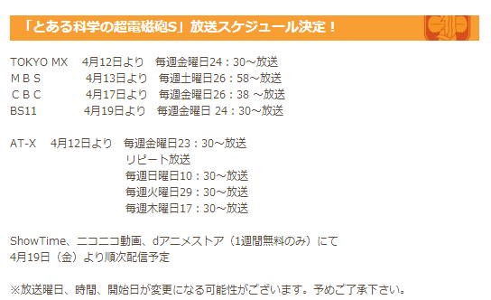 即将于春季开始播放,拥有广大粉丝群的《科学超电磁炮S》,终于公布了在电视台播出的正确时刻。而抢在各电视台之前的正是东京电视台的子公司动画频道AT-X(4月12日(五)23 时30 分),而紧接在后的则是晚一小时播出的TOKYO MX 电视台。