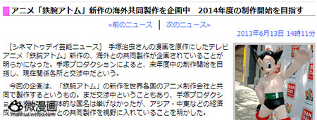 据日本Cinema Today网站报道,改编自手冢治虫原作漫画的TV动画《铁臂阿童木》正在企划新作,这部新作由手冢工作室和海外公司共同制作,目前正在和各方交涉,目标是2014年正式开始制作,2015年开播。 报道称,这次的新作将由日本的手冢工作室和来自海外各国的动画公司合作制作,手冢工作室的负责人没有透露具体国家,不过表示有意和亚洲、中东地区新兴国家的动画公司合作制作。看起来合作对象可能涉及多个国家。该负责人表示“这些新兴国家的现状,很像是《铁臂阿童木》播出期间处在高度经济成长期的日本,这一时期需要的,正是像《铁臂阿童木》这样,能够启蒙孩子们的动画作品。”据悉,日本总务省也对这一企划进行了赞助,提供了“国际共同制作支援助成金”。《铁臂阿童木》在1963年作为日本首部真正意义上的“连续剧电视动画”被制作出来,目前为止已经三度TV动画化。2009年香港和美国还共同制作了全CG动画电影《ATOM》。