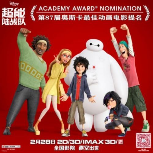 《超能陆战队》凭借良好口碑首周末票房便击败《星际穿越》,成为迪士尼最卖座的动画电影之一,日前在北美、欧洲多地上映都获得影评人与观众的五星好评。目前本片已荣获奥斯卡最佳动画长片提名,正在北美热映,并将于2月28日(大年初十)将以2D、3D、IMAX3D及中国巨幕全格式与中国观众见面。