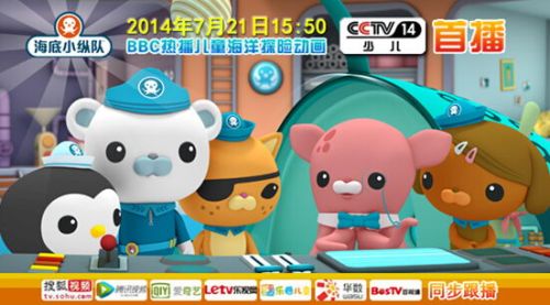 7月21日15:50分,《海底小纵队》(Octonauts)正式登陆央视少儿,并将在搜狐、腾讯、爱奇艺、乐视、乐看等视频网站同步跟播。播出内容包括动漫片前3季和7部特别篇。《海底小纵队》(Octonauts)以海洋作为故事上演的舞台,融合了动作、探险、海洋生物科学课程以及学龄前团队协作等内容。动画讲述了八个可爱小动物组成的海底探险小队的故事,以科学性、趣味性、教育性为主导,兼顾孩子的好奇心与求知欲。海洋冒险动画《海底小纵队》(Octonauts)动画于2010年在英国BBC少儿台首播之后,因其可爱的角色造型与充满趣味性的故事情节而受到万千粉丝的追捧。与高收视率相伴而来的则是衍生商品的销售热潮。作为一个新生的动画品牌,《海底小纵队》在短时间内获得了巨大的成功。动画中生动活泼、个性鲜明的角色形象以其独特的艺术魅力吸引了无数小朋友的视线。该动画先后于英国BBC少儿台、美国迪士尼幼儿频道、澳大利亚ABC电视台等国际一流播出平台播出。原标题:BBC学龄前动画品牌《海底小纵队》进军中国市场 来源:人民网-动画频道
