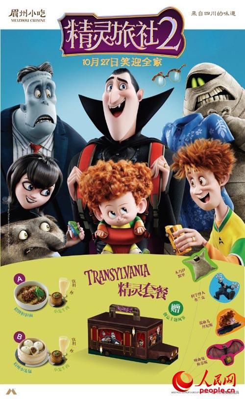 索尼影业公司的动画电影《精灵旅社2》与“眉州小吃”首次跨界合作,联手打造了中国第一家本土餐饮与好莱坞电影合作衍生品。“眉州小吃”,对于麻辣口味不断改良,不管是传统的担担面,还是创新的眉州小笼包,都开始增加孩子们愿意接受并津津乐道的美食,不但口味适中,而且营养丰富。索尼影业公司的《精灵旅社2》即将在10月27日上映,经典的银幕角色,再一次展露出他们 “萌翻” 的一面,不管是大人和孩子,都愿意走进电影院,看看它们让人忍俊不禁的一面。中国美食题材的动画电影,寥寥无几。“眉州小吃”,之所以会选择《精灵旅社2》并与之合作,其中除了“眉州小吃”近年来的不断创新之外另一个不可忽视的因素就是源自眉州小吃多年来对于川菜追求完美的精神与《精灵旅社》系列电影,有着不谋而合之处!作为《精灵旅社2》的国内合作餐饮,在电影上映的同时,特色精灵套餐将随餐赠送限量版新奇衍生玩具,所以《精灵旅社2》的上映正是让小朋友了解和体会“眉州小吃”独特魅力的恰当时机。索尼影业公司的动画电影《精灵旅社2》与“眉州小吃”首次跨界合作打破了外资快餐衍生品一贯的合作模式以及中国本土餐饮的传统格局,更标志着中国本土餐饮打入美国电影衍生品行业的第一步。(代曼)