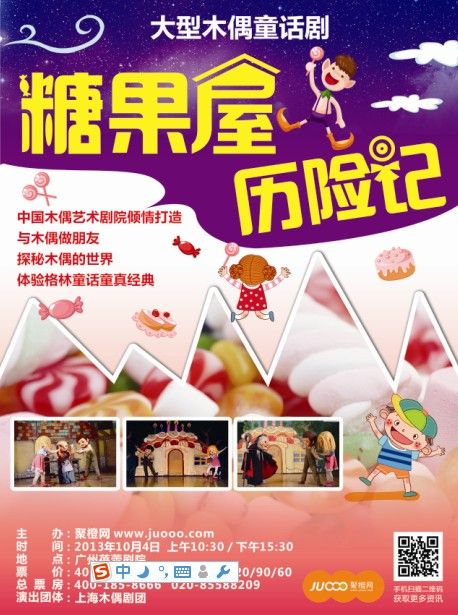 由中国木偶艺术剧院精心制作、改编自享誉世界的《格林童话》第十五篇《亨特尔与格蕾特》的大型真人木偶童话剧《糖果屋历险记》将于10月4日国庆期间来穗在蓓蕾剧院演出两场。和主人公零距离互动《糖果屋历险记》讲述了一对顽皮可爱的兄妹——亨特尔与格蕾特被可恶的老妖婆诱骗到用魔法制作的“糖果屋”,经历了一番斗智斗勇后最终取得了胜利。演出现场,主人公亨特与格蕾特将会走入观众席和台下零距离互动,和小朋友们一起齐心协力战胜老妖婆。届时伴随着欢快的音乐和跌宕起伏的剧情,小观众们还可以和亨特与格蕾特一起跳舞、唱歌、欢笑,感受心跳和快乐。异彩纷呈的舞台为了让小朋友们尽情领略奇异的童话世界,剧目在舞美和制作上做了精心设计,在色彩斑斓、造形逼真的布景舞台上,小朋友们能看到茂密的森林、用巧克力、奶油、饼干和炸面包圈作成的比房子还大的蛋糕魔法屋、变幻莫测的魔球,还有20多个身着夸张、离奇、艳丽的大头人物和动物道具服装的卡通造型伴着活泼明快的节奏进行精彩表演。树立孩子战胜困难的信心和勇气寓教于乐是本剧一大亮点,将真、善、美、勤劳、勇敢、真诚、友情等美好情操融入到动人的故事中,启发现代的孩子们树立不怕苦、爱劳动、爱护大自然的意识和集体主义观念,鼓励和教育孩子增强战胜困难和邪恶,走向成功和胜利的信心和勇气。剧目自2005年在人民大会堂上演以来,至今受到家长和孩子们的热烈欢迎。唯一国字号剧团本剧的制作方、中国木偶艺术剧院拥有中国最大的以木偶演出为中心的儿童室内乐园“木偶城堡”,1955年建团至今,创作演出了近300个剧目,摄制了《大林和小林》、《野天鹅》等100多集木偶电视剧,拍摄了《小铃铛》、《中国木偶艺术》等6部影片。剧团的演出足迹遍及中国和法国、俄罗斯、埃及、美国、巴西、新加坡、日本、印度、韩国等30多个国家。