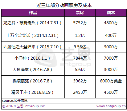制作成本高、周期长,票房又不高,在2014年之前,中国动画电影一直是鸡肋般的存在,而去年《大圣归来》如一剂春药,让动画片电影迎来了春天。然而从15年《大圣》之后,到今年即将结束的暑期档,上映的国产动画电影中,只有《大鱼海棠》和《熊出没》票房破亿。被给予厚望的《小门神》《年兽大作战》票房未过亿,郑钧与《玩具总动员2》导演联手的《摇滚藏獒》和顶着前作《龙之谷:破晓奇兵》光环的《精灵王座》票房更是仅有两三千万票房。对于不熟悉动画行业的大部分普通观众来说,三四千万的票房听起来也不错,但制作方能分到的票房收益粗略地只能按照总票房的三分之一左右,这样的票房跟这些动画电影动辄几千万,甚至上亿的制作成本相比,再加上宣发费用,高成本动画电影死得实在有点惨烈。上面表格总结的近两年国内声量较大的院线动画电影,对比之下不难发现一个怪现象:国产动画电影成本越高死得越惨,反倒是成本相对较低的《十冷》《大圣归来》和《大鱼海棠》还获得了不错的投资回报。为什么制作如此“费钱”的国产动画电影却赚不到钱呢?贪心的定位:低幼成人都想兼顾 顾此失彼。《西游记之大圣归来》9.56亿的票房奇迹曾让我们惊叹动画市场的潜力,《功夫熊猫3》的10亿票房又刷新纪录,大家还没来得及喘口气,3月份的《疯狂动物城》直接就拿下了15.3亿,而7月份《大鱼海棠》在参差不齐的评论声中也冲上了5亿元票房,没人敢估计市场容量到底有多大,但是可以肯定的是:好故事并不缺观众。2016暑期档的《新大头儿子和小头爸爸》7976万票房,2016年7月29日上映的《神秘世界历险记3》票房6541万元、2016年1月上映的《熊出没之熊心归来》票房28735万元、2015年暑期档的《赛尔号大电影5》5662万元,这些电影的票房均超过了投资更高的《摇滚藏獒》《精灵王座》。细究后,我们会发现《新大头儿子和小头爸爸》、《赛尔号大电影5》、《熊出没之熊心归来》、《神秘世界历险记3》这些票房和制作还算成正比的动画电影,定位清晰,受众就是儿童,根本不考虑成人受众,反正小朋友爱看,影院就会给排片,家长就会买单。而《大圣归来》、《大鱼海棠》、《十万个冷笑话》定位也很清晰,走成人路线,预告、海报一出来就看出典型的成人电影定位。相比而言《魁拔》《龙之谷》《年兽大作战》《小门神》《摇滚藏獒》《精灵王座》在定位上就比较尴尬,似乎想给大人看,要体现逼格,但故事又不够丰满,大人不免觉得幼稚,孩子又有点看不懂。比如,《小门神》里讨论的“下岗”、《摇滚藏獒》高唱的“梦想”、《精灵王座》嘶吼的“爱情”很难吸引小朋友的兴趣。好莱坞自然不乏《疯狂动物城》这种,两边都兼顾,两边都做的好的作品,但是对于刚刚起步的国内动画电影制作者而言,一开始就想通吃,两边兼顾,反而因为过于贪心,顾此失彼,顾彼失此,导致竹篮打水一场空。评分与票房不一定成正比 还要看基数和结构在日益理性的市场,观众越来越重视口碑,而口碑的唯一标准似乎就是评分,但是现在的评分体系也五花八门,专业平台和购票平台就是两种标准,一个更偏向影迷,如豆瓣时光,往往苛刻;一个面向普通观众,如猫眼、格瓦拉、淘票票,往往宽松。然而无论是专业平台还是购票平台,有一个有趣的现象就是,评分与票房并不是成正比的,评分高不一定票房就高。比如《小门神》《摇滚藏獒》《魁拔》《精灵王座》几部影片评分都不低,《精灵王座》甚至以豆瓣7.4分成为今年暑期档评分最高的国产动画电影,《魁拔》三部曲最高能到8分。但不争的事实是,这些电影的票房成绩都不好。难道观众口味或者审美有问题嘛?就是喜欢看口碑不好的电影,似乎也不是。因为票房创造纪录的《大圣归来》,在各平台评分人数和分数都较高。仔细对比几部电影的评分,会发现一个有趣的事实,即高票房作品的评分人数是低票房作品评价人数的几十倍甚至近百倍,这一规律在每个平台都高度一致。例如《大圣》的评分人数是《摇滚藏獒》的85倍,《精灵王座》的131倍。很多电影评分之所以很高,其实是因为评论基数较小人。当评价人数仅为两三千人的时候,证明参与评价的都是粉丝或者内圈观众,自然会倾向于对自己喜欢的东西给予高评价,但真正左右票房的其实是外圈或者金字塔塔基的大量观众,他们的评价才能反应市场整体的判断。评分的基数越大,越能反应大众口味,评分与票房越接近;越少,就更像是少数派的观点,评分与票房相关性并不强。当然,并不是说评价人数少的高分电影,人数一多分数一定会降低,但是存在这种可能,只有《大圣》这种,在高基数下,依然评分高的电影,评分才会与票房呈现正相关。也就是说,要达到正相关,这个评分需要有一个基数门槛,目前对此,业内并没有一个标准。除了基数外,评分结构也会影响票房。《大鱼海棠》是个很好的例子,各平台评分都不高,但看它评分结构,打一星和五星的比例最高,说明分歧巨大,正是因为这种分歧,形成了壮观的口水战。虽然评分较低,但是票房仍旧很高,很多时候,对于票房而言,争议是个好东西。单纯模仿好莱坞正在失灵 中国动漫很多时候都在模仿,模仿日本,模仿美国。《魁拔》是典型日式热血漫风格,挥舞着日本武士刀;藏獒变成了史努比去美国找猫王;年兽更像是好莱坞各种怪兽附体,《精灵王座》