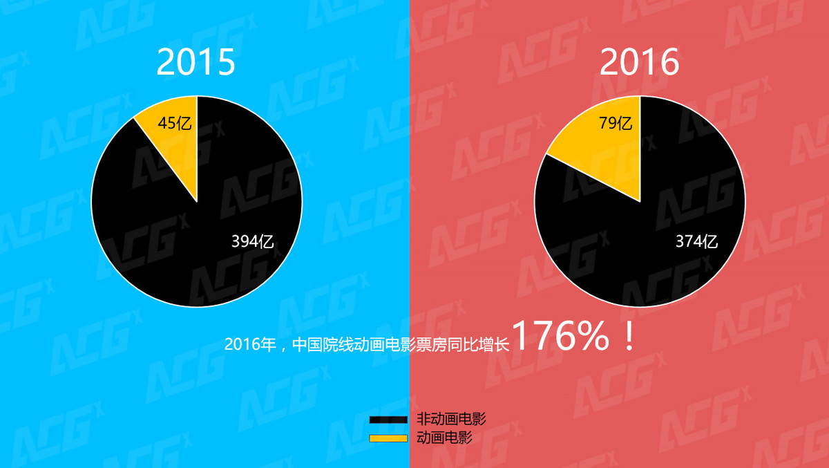 一到年终,各种盘点蜂拥而至,本文是关于2016年在中国院线上映过的动画电影盘点,通过简单的收集、分析,ACGx发现,相对于中国的院线真人电影过分看重票房数据,院线动画电影的票房其实早已不是最重要的了。票房过亿级动画电影:引进片立大功2016年中国全年院线动画电影总共为63部(其中《铠甲勇士捕王》和《小魔仙之魔法来袭》虽然是真人特摄片,但是由于其受众更接近动画受众,本文将其归纳在动画电影中),相比2015年的54部多了9部。详细的电影列表附在文末,各位看完文章后有兴趣可以一览。2015、2016中国院线动画电影总票房对比上图为2015年和2016年中国院线动画电影总票房对比。虽然2016年上映的电影数量只比去年多了9部,但是无论是在全国总票房的比例,还是去年同比增长,2016年都有明显的拉升。那么这些数据增长都来自哪些作品呢?ACGx作了一些简单的统计。2015年票房过亿的动画电影为8部,这8部动画电影带来的票房总额为31.38亿,占2015年全年院线动画电影票房的70%。2016年票房过亿的动画电影为14部,总共69.76亿票房,占全年动画电影票房的88%。其中有8部美国动画电影,迪士尼占了4部,这4部的票房之和为29.44亿人民币。在2015年迪士尼仅有《超能陆战队》以5.25亿这一部动画电影在中国市场过亿。引进片数量猛增的日本动画电影在中国也有4部破亿,票房之和为8.82亿人民币,要知道在2015年仅有《哆啦A梦:伴我同行》以5.29亿栖身过亿票房榜单中。 很明显,2016年中国动画电影之所以有如此之高的同比增长率,和引进片不无关系,特别是迪士尼连出几部佳片在中国都获得了较高票房,卖粉丝情怀的日本动画电影票房在中国也来了个小爆发。那么国产动画电影怎么样呢?2015、2016年票房过亿本土动画电影对比2015年过亿级票房的中国动画电影有3部,2016年仅2部。除了《熊出么》在这两年间继续蝉联过亿票房榜单外,前年还有中国院线动画电影冠军《西游记之大圣归来》和源自网络动画的《十万个冷笑话》,而去年仅有一部《大鱼海棠》。《大圣归来》在2015年引发了中国动画电影制作狂潮,然而本土动画电影在2016年依然处于既不叫好又不叫座的状态。其他媒体撰写的关于2017年全球动画电影展望的文章中提到,2016年迪士尼多部动画片爆发现象在2017年很难再现,而如《你的名字。》这种黑马近两年也难以再出现在日本,中国本土动画电影爆款更难,2017年的中国动画电影市场的票房两个字总结——堪忧。另外,ACGx还收集了2016年全年在中国影院上映的这些动画电影的联动游戏出品情况和国内衍生品授权情况。尽管现如今我们已经很难在APP Store或者应用商店里靠前的位置看到这些动画电影的同名游戏,但是它们确实是存在的。2016年14部票房过亿的动画电影中,有9部作品都有联动游戏。尽管已经裁掉了自家的游戏发行部门,然而迪士尼仍旧为国内上映的这4部迪士尼动画电影各出了一个同名游戏。虽然这4款手游的反响并不如其电影那般热烈,甚至可以用“圈钱”二字来形容,但是深谙泛娱乐之道的迪士尼至少在产业链的各个环节都是做到位的。另外,《功夫熊猫3》、《愤怒的小鸟》、《冰川时代5》和《熊出没》都授权给了国内手游厂商同名电影手游做影游联动,《爱宠大机密》授权给了EA做手游。日本的动画电影基本属于动漫IP旗下的剧场版,所以在国内就没有专门针对电影的游戏授权。不过,这14部动画电影在国内的衍生品授权倒是做得不错,根据ACGx的统计,有10部电影在中国国内有衍生品授权。不过相对于它们在国内的票房来说,游戏和衍生品授权的收入其实只是锦上添花。1000万~1亿票房区间动画电影:高举“合家欢”大旗票房在1亿以下、1000万以上的动画电影,2016年的数量为24部。其中美国动画电影3部,日本动画电影5部,中国动画电影11部,其他国家动画电影5部。2015年,这个票房区间是23部动画电影,其中本土动画电影是17部。在2016年这11部本土动画电影中,除了《我叫MT之山口山战记》属于魔兽老玩家的情怀片之外,其他10部动画电影都无一例外地打着“合家欢”旗号。在中国,“合家欢”可用于特定时期、特定片种的电影上。比如春节档,我们会看到每一部电影都叫“合家欢”,哪怕里面有不适合小朋友观看的色情擦边球情节;低幼向动画电影这些年也被包装成“合家欢”影片,尽管剧情简单到让家长不得不坐在影院里玩手机。那么问题就来了,内容和宣传错位的电影,怎么能获得高票房?这恐怕是这类动画电影最大的尴尬。2015、2016年千万至1亿票房区间的动画电影对比在这个票房区域中,有7部电影有同名手游,其中6部属于本土动画电影,然而ACGx的小编仍旧只是从新闻搜索中查询到这些电影同名手游……在衍生品授权这块,有12部电影有衍生品授权。从整个电影市场来看,这些票房几千万的动画电影,市场影响力不够广,不管是做游戏还是做衍生品,都很难依靠电影进行联动宣传,这是这个票房区间的院线动画电影最大的问题。1000万票房以下的动画电影:八仙过海,各显神通2016年1000万以下票房的动画电影数量为25部,全部为本土动画电影。票房1000万以下的本土动画电影是难以达到保本线的,那么它们到底要怎么赢利呢?在写这个部分的时候,ACGx小编专门在网络上观看了多部动画电影,发现了这一票房区间里动画电影存在一个很大的问题——制作水平参差不齐。有画