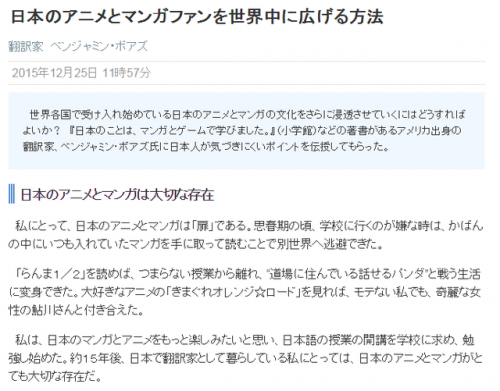 日本动漫如今已经被全世界各地的动漫迷们所喜爱。但是真正从影响力或者购买力而言,或许还是有很多值得提升的地方。为此,近日一名美国翻译家Benjamin Boas就撰文进行了分析。日本动漫是很重要的存在对于我而言,日本动漫是一扇门。当我青春期讨厌去学校的时候,就经常拿着漫画来阅读,从而逃避到另外一个世界去。后来,我为了进一步追求日本动漫乐趣,开始要求学校能够开设日语课程,并且在15年后以翻译家的身份生活在了日本。这种重要性不言而喻。连奥巴马总统都讨论过……实际上喜欢日本动漫的美国人并不是只有我而已。今年当安倍首相访问美国时,奥巴马总统就和他讨论过某些动漫作品,从而可见其在美国的知名度。当我在20年前接触漫画的时候,日本动漫还只是小众读物,但伴随着2003年《千与千寻》获得奥斯卡奖,此后日本动漫也逐步成为了全世界关注的焦点。日本漫画在美国市场也可以很畅销日本漫画只要能够进入美国市场,那么就有畅销的可能性。根据相关人士介绍,一些美漫作品一个月大约也就卖出10~20万本,但是《少年JUMP》光在日本国内每周都能卖出240万册,一个月下来就是960万册,足足是美国方面的50倍。受到美国读者喜爱的是《进击的巨人》和《一拳超人》美国文化跟日本有很多不同,但是在日本受到欢迎的作品往往也会被美国人接受。近年来《进击的巨人》跟《一拳超人》也都大受好评。另外包括《俺物语》《我的英雄学院》等也纷纷出现在了美国书店的货架上。作品能否被接受,关键是开头能否有亲和力然而并不是说所有日本的人气动漫都能被美国人接受。仅仅品质很高,未必就能让大家买账。日本作品想要走红世界,那么开头能否有亲和力非常重要。例如说,《美少女战士》《龙珠》这样的作品在目前30多岁的美国人群体中拥有很高知名度,甚至于一些人将其误认为是美国本土作品。《龙珠》暂且不论,明显是日式风格的《美少女战士》却能造成这种误解,恐怕对于日本人也会很惊讶吧。问题就在于这里:要在美国受到喜爱,那么就不能让人潜意识想到“这是日本的作品”。如果必须要拥有一定文化背景的理解,那么对日本不熟悉的外国人就很难从作品中获得乐趣。因此,今后全世界的动漫迷都在期待日本能够创作《千与千寻》这样老少皆宜的作品。表现手法上需要下功夫想扩大知名度,就要在表现手法上下功夫。例如很多美国人认为:日本动漫有着太多性方面的描写了。我高中时期特别喜欢的《乱马1/2》就频繁有女性裸露上半身的描写,结果就被人误认为是个“看成人漫画的高中生”。或许日本人觉得这只是一种表现手法,但是美国的审核制度可不一样。光是露出部分身体,就会令电视台拒绝播出了。同样,日本店铺中随处可见一些偶像角色,但这种角色很难在美国的公众场合展示。因为角色看起来是未成年人,身体裸露程度又很高,为此有被认为是儿童色情的风险。总之,美国是很难理解日本偶像文化的。有些类型不能吸引读者还有一种文体就是,对于美国人而言,“动漫只是给小孩子看的”。所以目前在美国的日本动漫粉丝大多是10多岁的青少年。但是日本却有很多以成年人为读者的漫画,例如此前就有刻画福岛第一核电站内容的作品。此外,运动题材作品,例如《排球少年!!》等也都对于美国人而言显得比较陌生,所以不容易吸引读者。无论怎样,只要不是美国人喜欢的类型,那么就很难被引进。毕竟任何一家出版社都不愿意承担风险。那么应该如何面向世界推广呢?难得日本拥有这么多的好作品,却很难进行推广。那么要如何才能让海外粉丝认可呢?那么,我们应当将目光投向视频网站服务,这种形式能够比出版漫画更快地展现在大家面前。而这么做的话,即便是对于动画不太关心的人,也有更多看到的可能性。并且知名度也可以伴随社交平台进行推广。尽管日本方面大多是先有漫画再进行改编动画,但美国的话往往是先看了动画,觉得有趣才去追漫画的。并且现在已经有越来越多的人开始用网络观看动漫以及电视剧了。也进行一些新手法的挑战无论是创造了什么好的作品,光靠日本目前的商业战略和手法,恐怕很难在全世界引发关注。因此需要一些新的手法。例如说跟美国的企业展开合作等,而如果能够积极听取外国人的建议,那么或许就会诞生新的契机吧!