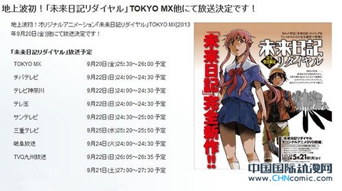 人气TV动画《未来日记》宣布BDBOX化决定,包括TV版全26话、OAD《未来日记Redial》和《未来日记试播版》、TV未放送的《里未来日记》等内容,预定2013年11月29日发售。同日发售的还有演唱会《未来日记 The Live World》的BD。另外,7月发售的OAD《未来日记Redial》宣布将进行TV放送,预定9月20日25:30~26:00在TOKYO MX台首播,之后千叶电视台、神奈川电视台、埼玉电视台、SUNTV、三重电视台、岐阜电视台、TVQ九州放送、BS11也会陆续播出。《未来日记》原作漫画由えすのサカエ创作,2006年至2011年在角川书店《月刊少年ACE》杂志连载,描写可以看到未来的“未来日记”的持有者们,为了成为“神”而互相死斗的物语。目前漫画《未来日记》本篇已经完结,单行本全12卷累计销量400万部。这次BDBOX化的TV动画版《未来日记》由ASREAD制作,在2011年10月至2012年4月期间播出。《未来日记》BDBOX定价39,900日元,预定2013年11月29日发售收录内容:TV动画全26话、7月发售的新作OAD《未来日记Redial》、漫画第11卷限定版同捆的《未来日记 试播映像(20分钟)》、来自20位声优的评论音轨、BD特典《里未来日记》、えすのサカエ绘制的BDBOX包装(预定)、16页小册子、TV版全OST CD、NCOP/ED、宣传广告、贩促PV《未来日记 The Live World》BD定价6090日元,预定2013年11月29日发售收录内容:2012年7月29日在SHIBUYA-AX召开的《未来日记》演唱会的映像BD。出演者包括妖精帝国/飞兰/OLDCODEX/ChouCho/悠季/ニルギリス/六弦アリス/畑亚贵/村田知沙/富樫美铃/相泽舞/川原庆久/白石稔。特典为8页小册子、片花映像。