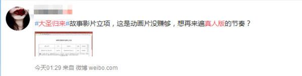 根据7月(中旬)全国电影剧本(梗概)备案、立项公示显示,《大圣归来》真人版的出品方正是正是动画电影《西游记之大圣归来》的出品方——横店影视制作有限公司。动画电影《大圣归来》上映近一个月以来,不断刷新票房纪录,甚至引发大批“自来水”(自发网上宣传力捧这部电影的粉丝)热捧。收获媒体影迷超大面积好评点赞,成为暑期档最值得关注的现象级作品之一。此次真人版拍摄计划曝光,果然和先前部分业内人士的猜测一致,电影的备案单位就是动画版的理想出品方横店影视制作有限公司,可见“大圣归来”不自觉就成了“怎么才能一直赚钱”的热门IP。