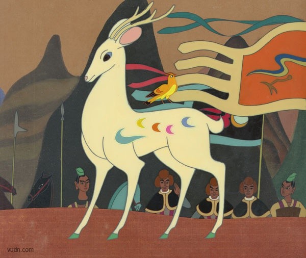 1981年上海美影厂的《九色鹿》根据敦煌壁画《鹿王本生》改编。一个捕蛇人不慎落水,幸得九色鹿搭救,才保住性命,却企图用九色鹿领取赏金。