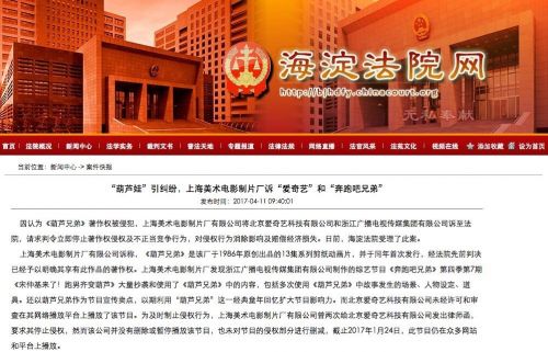 4月11日消息,根据海淀法院官网消息,因认为《葫芦兄弟》著作权被侵犯,上海美术电影制片厂有限公司将北京爱奇艺科技有限公司和浙江广播电视传媒集团有限公司诉至法院,请求判令立即停止著作权侵权及不正当竞争行为,对侵权行为消除影响及赔偿经济损失。日前,海淀法院受理了此案。上海美术电影制片厂有限公司诉称,《葫芦兄弟》是该厂于1986年原创出品的13集系列剪纸动画片,并于同年首次发行,经法院先前判决已经予以明确其享有此作品的著作权。上海美术电影制片厂发现浙江广播电视传媒集团有限公司制作的综艺节目《奔跑吧兄弟》第四季第7期《宋仲基来了!跑男齐变葫芦》大量抄袭和使用了《葫芦兄弟》中的内容,包括多次使用《葫芦兄弟》中故事发生的场景、人物设定、道具。还以葫芦兄弟作为节目宣传卖点,以期利用“葫芦兄弟”这一经典童年回忆扩大节目影响力。而北京爱奇艺科技有限公司未经许可和审查在其网络播放平台上播放了该节目。为及时制止侵权行为,上海美术电影制片厂有限公司曾两次给北京爱奇艺科技有限公司发出律师函,要求其停止侵权,然而该公司并没有删除或暂停播放该节目,也未对节目的侵权部分进行删减,截止2017年1月24日,此节目仍在众多网站和平台上播放。上海美术电影制片厂有限公司认为,浙江广播电视传媒集团有限公司擅自在其制作的节目中大量抄袭和使用《葫芦兄弟》的剧情、角色形象、音乐、片段等,并以《葫芦兄弟》为卖点和涉案节目主要剧情内容宣传其综艺节目,已侵犯了原告的著作权,同时构成对原告的不正当竞争,应承担侵权责任。而北京爱奇艺科技有限公司未经许可擅自播放涉案节目,帮助浙江广播电视传媒集团有限公司实施侵权行为,构成共同侵权,应承担连带责任。故根据《著作权法》、《不正当竞争法》及相关司法解释诉至法院,要求判令两公司立即停止侵权、赔偿损失200万元并就上述侵权行为在《人民法院报》上消除影响。