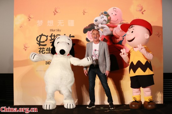 史蒂夫·马蒂诺与史努比人偶开心热舞 [中国网]本周三,由二十世纪福斯出品的电影《史努比:花生大电影》在北京举办了中国新闻发布会,导演史蒂夫·马蒂诺专程来到现场与大家分享台前幕后的故事,并在现场亲自画了一幅超萌的史努比图画。史蒂夫·马蒂诺同时也是备受大家喜爱的《冰川时代4》的导演。史努比这个诞生65周年的卡通人物被好莱坞著名动画制作团队蓝天工作室,首次以3D形式搬上大银幕,将于11月6日以3D、中国巨幕的版本同步全球在中国内地全面上映。发布会现场播放了《史努比:花生大电影》的6个精彩片段,让到场的媒体十分惊艳,人们熟悉的花生角色查理·布朗、史努比、查理布朗的妹妹、露西等等跃上大银幕,通过3D效果让观众感觉近在咫尺,更觉可爱。透过这些零星的片段,也能看到电影的一些核心元素,爱情、友情等等,经常闹出一些搞笑“囧”事的查理·布朗在这一集中会迎来自己绽放光芒的时刻,而史努比也会在天马行空的幻想中上演一出决战“红色男爵”英雄救美的故事。导演在现场与史努比人偶开心热舞,展现了非常可爱、亲切的一面。导演马蒂诺在现场表示:“一切都关乎于保留这个拥有长久历史的文化遗产,我们不能搞砸。让新一代的孩子们在电影院中认识电影中的角色,这就是一个机会。我们要做的是把《花生漫画》带给大众的感受呈现在大银幕上,漫画中的角色不会改变,但将会以全新的型态展现他们几十年来带给大众的美好。”现在,几乎所有的动画都是用电脑绘制而成,很少年纪40岁以下的人还会看纸上有趣的漫画,而家庭观众也期待看到更多有视觉特效、快动作和知名影星的电影。而《史努比:花生大电影》的制作竟然回到绘图板上,试图保留创作者在创作时的精神和作品原貌。为了能还原漫画的原滋原味,马蒂诺也曾苦学如何画好《花生漫画》,在现场,他也快速的用中国毛笔画了一幅史努比,并赠送给了二十世纪福斯的中国区代表。二十世纪福斯中国区市场总监申慧女士表示:“上次跟各位见面还是年初上映《王牌特工:特工学院》的时候,已经过了半年的时间,福斯沉寂了很长的时间,终于迎来了一个开始,接下来福斯将有三部电影上映,11月4号上《移动迷宫2》,11月6号上《史努比:花生大电影》,11月25号有今年最重磅的一部科幻电影《火星救援》,今天我们非常高兴从史努比开始带给大家福斯的体验月,让大家感受一下福斯电影带来的震撼。导演史蒂夫·马蒂诺的这部《史努比:花生大电影》,是今年下半年大家最期待的动画盛宴。我自己就是史努比的忠实粉丝,电影体现出了史努比和它的主人查理·布朗之间忠实的感情,我自己也有一只可爱的小狗每天和我生活在一起,所以感触更深。这是一部适合各个年龄段观众观看的电影,无论你已经是史努比的粉丝,还是你刚刚认识史努比,都会被这些花生漫画的角色吸引,因为他们个性鲜明,非常可爱,且从他们身上都能找到我们每一个人的影子,因而产生共鸣。”到场的嘉宾表示:“史努比上一部影像作品大概是35年前了,这一次用全新的3D技术搬上大银幕让人兴奋。《花生漫画》系列是用成人的视角讲述孩子们故事的最佳作品,逗趣又不失人生观点。”《史努比:花生大电影》是曾经创造出《冰川时代》系列与《里约大冒险》系列的好莱坞金牌动画团队蓝天工作室的最新力作。曾经执导过《冰川时代4》和《霍顿奇遇记》的史蒂夫·马蒂诺担纲导演,由舒尔茨之子克雷格亲自担任制片。片方将用曾担任《史努比的惊险夏令营》和《聪明狗走天涯》的导演——比尔·莫伦茨(已过世),用以往存档的声音为“史努比”配音。今年是史努比诞生65周年。史努比最早出现在漫画家查尔斯·舒尔茨1950年连载的作品《花生漫画》中,是主人翁查理·布朗养的一只黑白花的小猎兔犬,品种为米格鲁犬。史努比是世界上最纯真、善良的狗,它的漫画形象早已风靡世界,成为拥有在75个国家超过3亿5千万粉丝的顶级偶像,它曾在1965年4月9日登上《时代周刊》封面,与肯尼迪、赫鲁晓夫、格瓦拉、毛泽东、蒋介石、邓小平以及披头士这些影响世界的著名人物并肩而立。并且在1969年5月,美国阿波罗10号飞船将自身指挥舱和月球舱分别命名为“查理·布朗”和“史努比” ,两者一度成为此次太空计划的半官方吉祥物。不过在原作中,史努比于同年的3月14日就已经登上了月球,而它在漫画当中也得意地表示自己是“第一个登上月球的小猎犬”。《时代周刊》曾评价,《花生漫画》中那些小孩带着明确、坚定的眼神看这个世界,那些关于信仰、人生观和教育,这些现代社会中的复杂课题,看来都显得有趣。这些由漫画家查尔斯·舒尔茨所创造、幽默且带点讽刺性的角色,在平日和周日的报纸上活了过来,这些年来,带给美国和全球读者引人入胜的智慧,并且以简单且令人印象深刻方式,解读社会中困扰着大人们的各种问题。