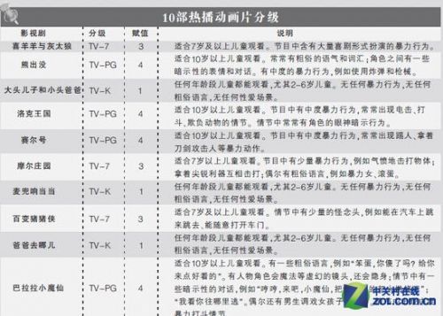 国游戏分级制度迟迟不出台,动画片方面的分级制度近期有了新进展,但这个分级制度并不是官方指定的,而是民间自制。 分级标准TV-K(2-6岁):这类影视剧适合所有儿童观看,尤其适合2-6岁儿童。节目无任何暴力行为或暴力语言;无任何脏话、粗话;无任何与性爱有关的语言或场景。TV-G(6-7岁):这类影视剧适合所有儿童观看,但不是特意为2-6岁儿童设计。节目几乎没有暴力行为;几乎没有脏话、粗话;几乎没有与性爱有关的语言或场景。父母可以放心让幼儿观看这类节目。TV-7(7-10岁):这类影视剧适合7岁及以上儿童观看。节目可能含有喜剧形式扮演的暴力行为;偶尔有脏话、粗话;几乎没有与性爱有关的语言或场景;有少量的幻想、怪念头,需要儿童已经能够分辨什么是真实能做的事情,什么是虚幻的事情。父母要进行筛选和监护,尽量不要让7岁以下儿童观看。TV-PG(10-14岁):这类影视剧不适合年幼儿童观看,尤其是10岁以下儿童不适合观看。节目中可能含有以下内容:中度的暴力行为;有一些脏话、粗话;有一些与性有关的语言或场景;有一些暗示性的对话等等。儿童观看此类节目时,父母需要对节目内容进行引导。TV-14(14岁以上):这类影视剧14岁以下的儿童都不适合观看。节目可能含有激烈的暴力行为;或者非常多的脏话、粗话;较多与性有关的语言或场景;虚拟场景比较多等等。父母必须注意不要让14岁以下儿童独自观看这类节目。具体动画分级情况大家所熟知的《喜洋洋和灰太狼》只适合7岁以上的小朋友观看,《爸爸去哪儿》全年龄适合观看。原标题:婴幼儿不能看喜洋洋 民间动画分级制出台来源:CBSi中国·ZOL 作者:王晓帆