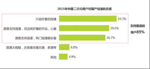 但是国漫在国内受众群里的仇恨值并不高,相反,虽然由于目前体制并不完善、产业链并未成熟的背景下,但是将近有9成的用户对于国漫保持支持的态度。