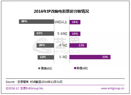 2016年,IP依然有资格成为泛娱乐行业备受热捧的主角。据艺恩电影智库数据显示,2016年过亿电影数量86部,累计创造398.24亿票房,其中IP改编电影占据37席。虽然仅占2016年全年上映电影503部的7%,但其却创造了全年35%的票房,占过亿票房电影产值的38.94%,IP改编电影的造金能力由此可见一斑。5部影片合力拿下61亿票房 动作、奇幻电影最吸金2016年由IP改编的电影有88部,而票房过亿的仅37部,内容覆盖爱情、动作、奇幻、悬疑、喜剧等类型,合力揽入155亿票房。过亿国产IP电影19部,由小说《西游记》改编的影片《西游记之孙悟空三打白骨精》以12亿票房成绩问鼎冠军。8部爱情片除《从你的全世界路过》外,其余电影票房均在1-5亿区间。与此同时,票房成绩超10亿的影片共计5部,强力吸入61亿票房,票房占据过亿IP电影总票房产值近四成。其中,动作、奇幻类影片完全占据了TOP5,就片单来看,动作、奇幻类影片吸金能力最强,共收获96.66亿票房,占比达62%。片单中,大多数影片票房集中在1-3亿,爱情片占比近三成,除音乐改编的电影《睡在我上铺的兄弟》外其余均为文学作品IP。文学作品成为IP改编主力军 漫画、游戏未来增势明显2016年我国大陆地区由IP改编的过亿影片依然以文学作品为主,漫画紧跟其后。值得一提的是,这些影片中有6部漫画改编作品,两部游戏改编作品,类型均以动作和动画为主。由游戏改编而成的两部电影票房均超过5亿,其中,游改电影《魔兽》以14.7亿的成绩高居榜首。2016年是漫画和游戏IP爆发的一年。据研究报告显示,2016年我国互联网漫画用户规模预计超过7000万人,且未来还将保持增长趋势。去年,华谊兄弟和童石网络联合宣布成立合资公司“角虫娱乐”,“二次元”内容被正式纳入传统影视公司华谊兄弟的内容矩阵。王中磊表示:“这是一个IP共生的时代,漫画、影视、游戏公司的IP生态互相渗透将成为常态。”2016年夏天,游戏改编的电影《魔兽》引发的票房奇迹与粉丝狂潮,使影游联动再次被提上台面。据悉,未来将有更多的游戏被改编为电影。近两年,中国的游戏公司已经逐渐展开“影游联动”的布局,以网易、巨人等为代表的“游戏业巨头”以及一些中小型游戏公司,纷纷成立影视公司,着手完成旗下游戏IP产业链的打造。另一方面,以光线、华谊等传统民营影视业巨头也以收购或注资的方式积极向游戏公司抛出橄榄枝。上海电影节期间,网易和巨人相继宣布了各自的影视开发计划。在两家现已公布的影视化项目中,网易旗下《天下3》将改编为真人电影和电视剧,《梦幻西游》在此基础上还将追拍动画大电影;巨人方面,旗下游戏《征途》会电影、电视剧同期开发,《球球大作战》等将改编为动画电影。除了网游外,市场对电竞题材也非常看好,腾讯影业副总经理陈洪伟就曾表示:“‘游戏改编电影’是一个宽泛的概念,它包含了三个层面:第一类是简单的游戏IP影视化,就像《魔兽》这种;第二类是将整个游戏文化变成电影的一部分,比如文学IP类中的网游文,它在影视化的过程中势必要呈现出很多游戏元素;第三类是电竞题材改编电影,虽然电竞现在还是一个小众运动,但是它的经济潜力一定会引发关注。”