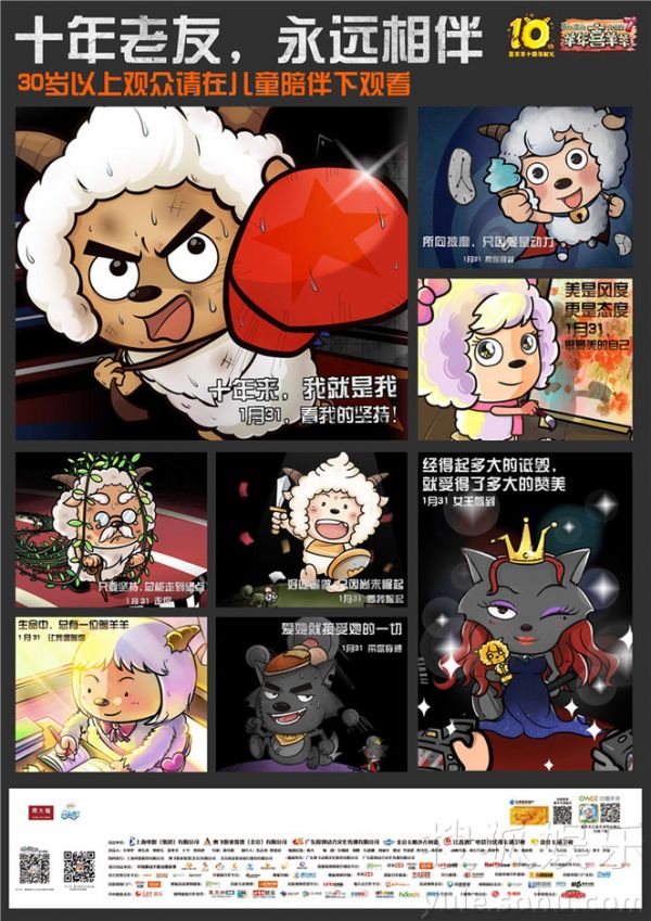 近日,由上海电影(集团)有限公司、奥飞影业投资(北京)有限公司、广东原创动力文化传播有限公司出品,北京卡酷少儿频道、优漫卡通卫视、嘉佳卡通卫视联合出品的国产动画大电影《喜羊羊与灰太狼7》曝光了一组“格言体”海报,羊村长带领众羊以欢乐逗趣的形式迎接本命年。海报中,每个角色的个性和电影中的命运巧妙蕴含在各自的人生格言里。 作为“喜羊羊”品牌的十周年献礼作品,《喜羊羊与灰太狼7》融合了穿越、冒险、爆笑、奇幻等精彩元素,并将于2015年1月31日与全国观众见面。