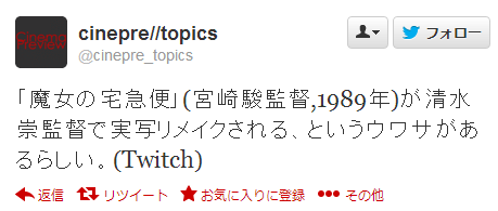 据加拿大电影网站Twitch的报道,吉卜力工作室的名作剧场版动画《魔女宅急便》将拍摄真人电影版,并且监督将由凭借恐怖电影《咒怨》系列进入好莱坞的清水崇担任!