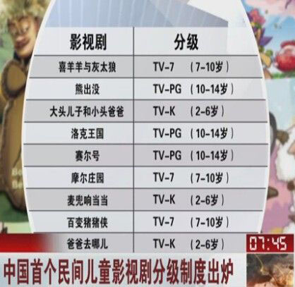 2014年12月19日,中科院陆宇斐博士提出了中国首个民间儿童影视剧分级标准。他将儿童影视剧分为五级,分别为TV -K级(2-6岁)、TV-G级(6-7岁)、TV-7级(7-10岁)、TV-PG级(10-14岁)、TV-14级(14岁以上)。根据该分级标准,《大头儿子和小头爸爸》为TV-K级(2-6岁),《喜羊羊与灰太狼》为TV-G级(6-7岁),《熊出没》则为TV-PG级(10-14岁)。但截至目前,中国尚未出台官方的动漫分级制度。
