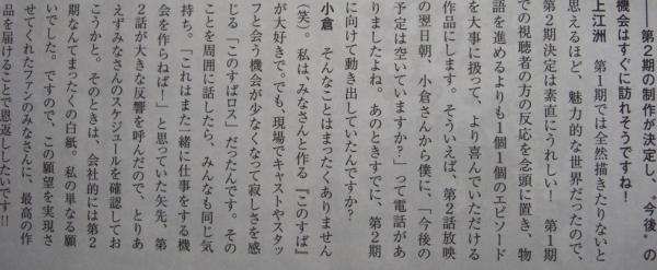 小仓(制作人):并不是这样(笑)。我只是很喜欢跟大家一起制作的《为美好的世界献上祝福!》而已。不过很少有机会在现场跟声优以及制作人员见面,因此也觉得挺寂寞的。当我跟其他人说到这个事情的时候,发现大家也有同样的想法。为此就想着“必须要创造一个能够跟大家再度一起工作的机会!”为此,当看到第二集引发了不错的反响之后,我就首先确认了一下大家的日程安排。不过当时公司里面可完全没有第二季的计划,只是我个人的意愿而已。因此,对于让这个愿望成真的各位粉丝,我们也希望能够以最棒的作品作为报恩!!