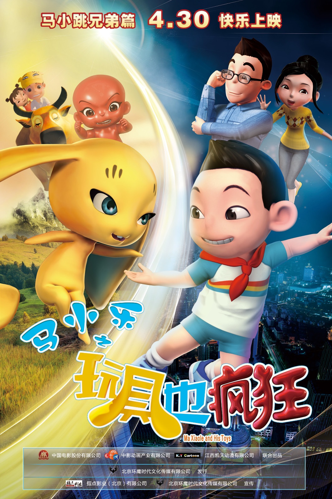 《马小乐之玩具也疯狂》时空对决版海报1905电影网讯 日前,动画电影《马小乐之玩具也疯狂》发布时空对决版海报,正式定档4月30日。动画电影《马小乐之玩具也疯狂》是 “马小跳”系列动画的兄弟篇, 此次电影对该丛书故事、形象进行了重新塑造,故事围绕主人公马小乐的一次意外穿越之旅, 展开一系列啼笑皆非的故事,在影片元素上增加了奇幻、冒险的元素。各色萌宝玩具齐上阵 上演时空对决此次公布的海报不仅包含马小乐一家的主要角色,海报中的新鲜元素“数码宝贝小黄帽”和智能家教“大头”也十分抢眼,梦幻般的时空隧道映衬着过去和现在两个不同的时间空间,各色萌宝玩具位列其中。海报中影片男主角有意与小黄帽示好,而小黄帽背后的大头却一脸愁容,从两个小精灵身上隐隐感觉到一股剑拔弩张的气氛。聚焦儿童视角 亲子两代换位思考影片中,马小乐是一个课业繁重的小学生,爸爸还发明了一个智能玩具“大头”来监督他。苦恼的马小乐偶然遇到了拥有神奇能力的精灵“小黄帽”并和他成了好朋友,要学习还是要快乐,大头与小黄帽各显神通,展开较量。影片让儿童与家长在观影中换位思考,家长体会到小朋友的烦恼,同时又和孩子一起回到属于自己的童年。在故事情节的设计和人物性格刻画上,也是力求从“儿童视角”出发,说孩子所说,想孩子所想,和他们一起放飞心灵,一起展开想象的翅膀,进入他们的梦想世界。据悉,电影《马小乐之玩具也疯狂》从儿童的视角出发,通过穿越的手法,将儿时童年与现代生活相结合,同时加入欢乐、冒险、奇幻等儿童电影喜闻乐见的动画元素。