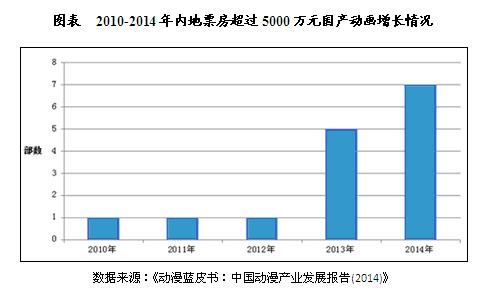 2014年票房超过5000万以上的国产动画电影达7部,上映档期多集中在暑假。相比2013年5部的产量和2010-2012年每年只有一部超过5000万票房收入的情形,2014年国产动画电影票房可谓表现不俗。