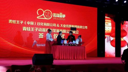 2015年1月11日,大业传媒漫奇妙中国动漫商业运营携手青蛙王子(中国)日化有限公司,在漳州青蛙王子工业园举行了隆重的签约仪式,共同成立“青蛙王子动漫产业发展有限公司”,掀起动漫产业新型整合营销模式。青蛙王子动漫产业发展有限公司成立时值“青蛙王子”公司成立20周年庆典,双方领导在来自全国各地的850余位嘉宾、经销商、供应商、行业协会以及省市区有关部门领导的见证下,共同提出了未来公司的合作模式与长期发展战略,两家公司将合力在动漫制作、儿童教育、公益活动、戏剧、大型活动、快消品等多领域展开合作,力图强强联手,共创中国动漫产业新纪元。漫奇妙是大业传媒集团旗下一家集动漫商业策划、动漫内容原创、动漫明星经纪、动漫内容营销、动漫综合授权、动漫衍生品研发推广销售等为一体的动漫原创商业运营公司。而“青蛙王子”则是国内婴童个人护理行业的领先企业。早在正式签约前,漫奇妙就与青蛙王子(中国)展开了相关领域的合作,除为品牌提供形象设计与授权外,更是参与策划制作了《青蛙王子》系列动画、“青蛙王子”公益夏令营、《青蛙王子》舞台剧等项目,并获得了强烈反响与各界支持。此番两家结合双方优势,整合资源,必将使青蛙王子的动漫文化更加深入人心,提升集团差异化营销的竞争优势。日后,两家公司将继续秉持青蛙王子“呵护儿童健康成长”的经营理念,通过支持国内的原创动画,制作、传播优质的动漫内容,为广大的儿童及家庭传播一份正能量。双方领导合影留念基于中国文化部出台的《关于扶持动漫产业发展的若干意见》,漫奇妙紧跟动漫产业的大好春风,通过此次与青蛙王子的合作积极推动传统动漫产业升级,延伸产业链条。漫奇妙首创动漫企业化、企业动漫化的新营销思路,希望为中国动漫产业发展提供新的思路与经济增长点。即在丰富动漫产品表现形式与传播方式的同时,通过整合营销的新型模式,努力提升中国动漫产业国际竞争力。