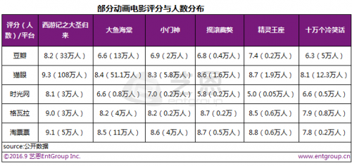 难道观众口味或者审美有问题嘛?就是喜欢看口碑不好的电影,似乎也不是。因为票房创造纪录的《大圣归来》,在各平台评分人数和分数都较高。仔细对比几部电影的评分,会发现一个有趣的事实,即高票房作品的评分人数是低票房作品评价人数的几十倍甚至近百倍,这一规律在每个平台都高度一致。例如《大圣》的评分人数是《摇滚藏獒》的85倍,《精灵王座》的131倍。很多电影评分之所以很高,其实是因为评论基数较小人。当评价人数仅为两三千人的时候,证明参与评价的都是粉丝或者内圈观众,自然会倾向于对自己喜欢的东西给予高评价,但真正左右票房的其实是外圈或者金字塔塔基的大量观众,他们的评价才能反应市场整体的判断。评分的基数越大,越能反应大众口味,评分与票房越接近;越少,就更像是少数派的观点,评分与票房相关性并不强。